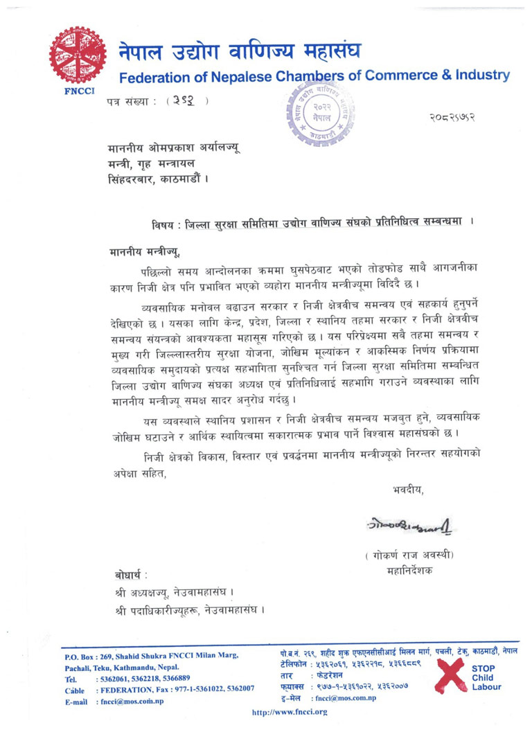 नेपाल उद्योग वाणिज्य महासंघको आग्रहमा सुरक्षा प्रत्याभूतिका गर्न सरकारले गरेको उक्त निर्णयका लागि महासंघ गृह मन्त्रालयप्रति हार्दिक आभार व्यक्त गर्दछ । महासंघले निजी क्षेत्रको सुरक्षाको प्रत्याभूतिका लागि केन्द्र र जिल्लास्तरीय सुरक्षा समितिहरूमा महासंघको प्रतिनिधित्व सुनिश्चित गर्न सम्बन्धित जिल्ला नगर उद्योग वाणिज्य संघका अध्यक्ष एवं प्रतिनिधिको सहभागिताका कार्तिक २ गते गृह मन्त्रालयमा पत्राचार गरेको थियो ।