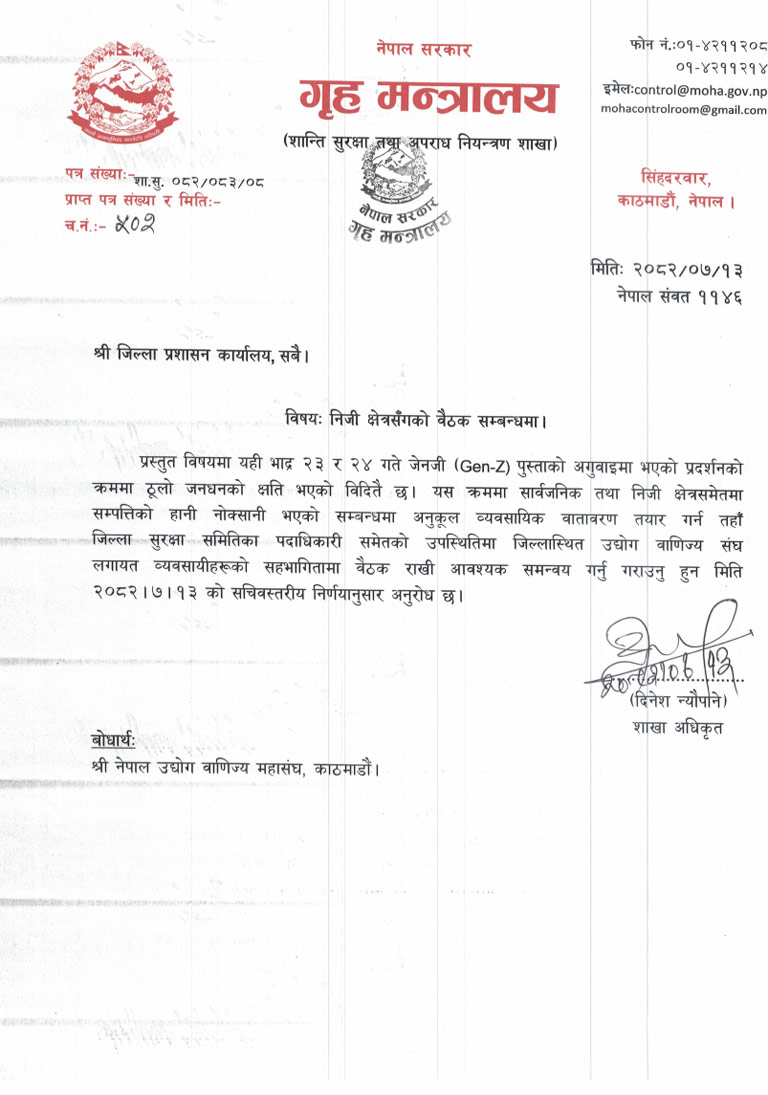 सरकारले अनुकूल व्यवसायिक वातावरण तयार गर्न जिल्ला सुरक्षा समितिका पदाधिकारी समेतको उपस्थितिमा जिल्लास्थित उद्योग वाणिज्य संघ लगायत व्यवसायीहरूको सहभागितामा बैठक राखी आवश्यक समन्वय गर्न सबै जिल्ला प्रशासन कार्यालयलाई विहीबार परिपत्र गरेको छ ।